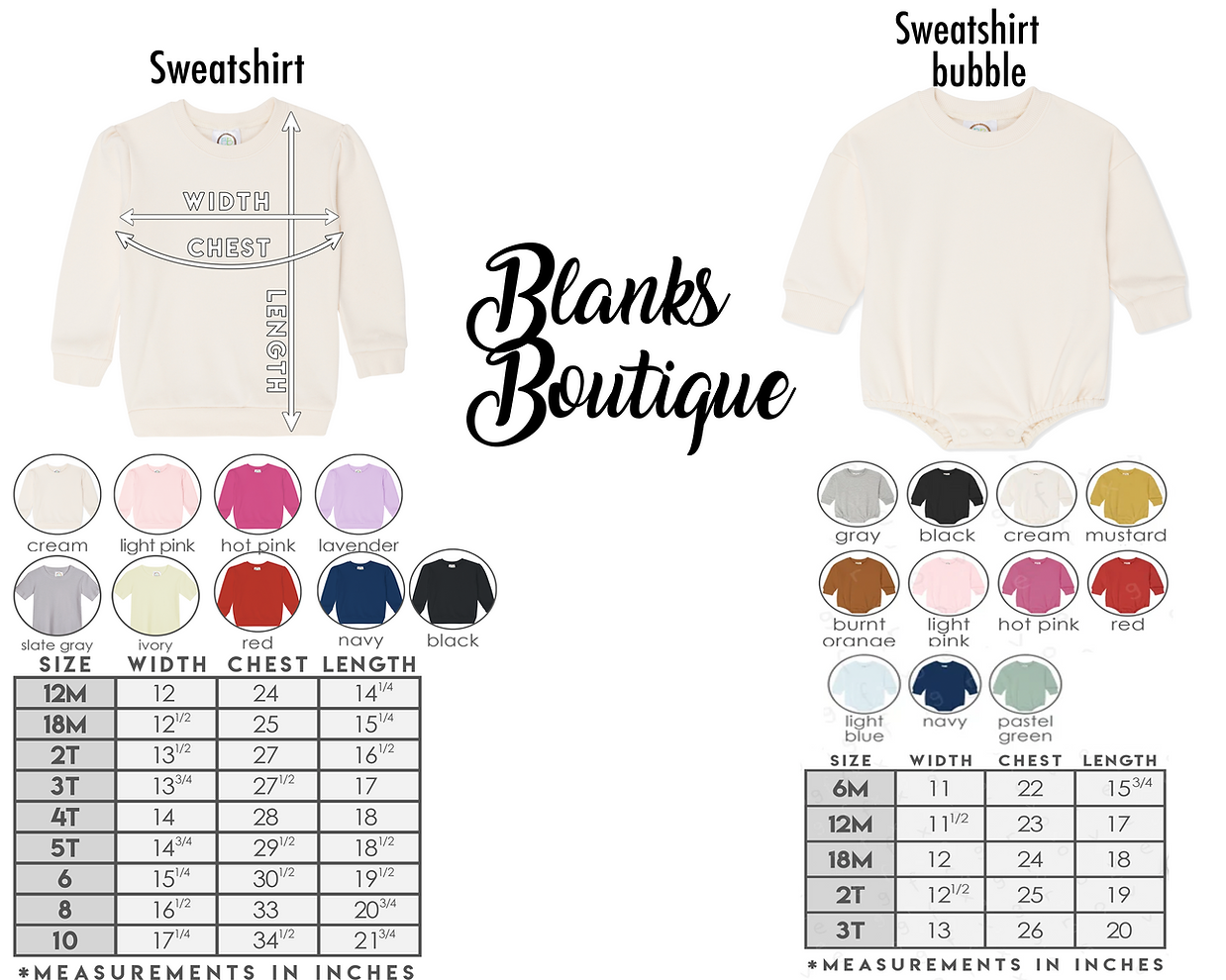 Pictured on a light blue bubble romper with light pink thread. Please leave the first + middle name personalization in the special instructions box on the cart page prior to checkout. If you'd like a different color sweatshirt and/or thread color, please refer to the color chart and leave a note in the special instructions box on the cart page prior to checkout.